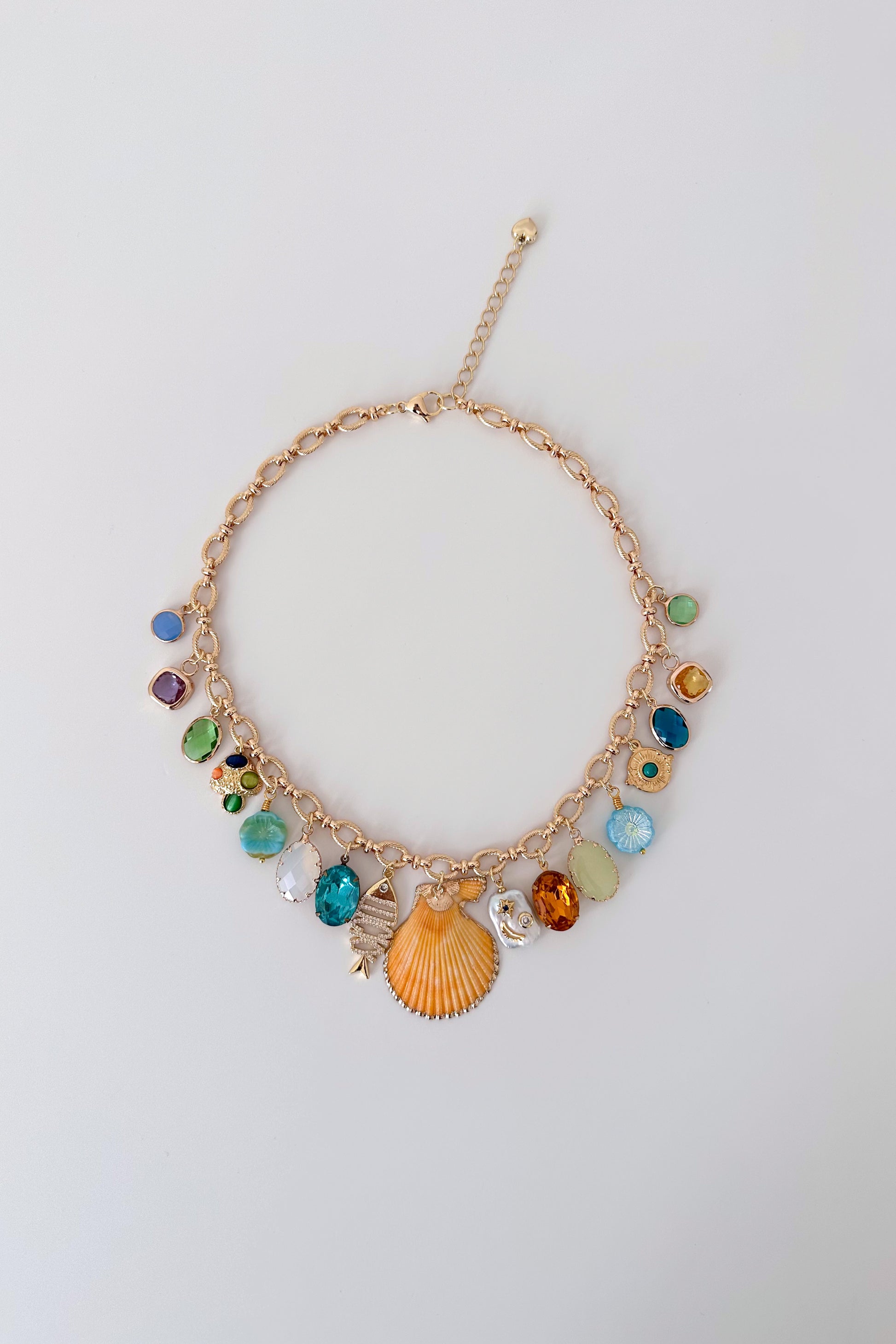 Gold plated charm necklace featuring assorted dead stock charms - variety of vintage raw brass, resin, acrylic, zinc alloy, glass, crystal, and gold plated charms