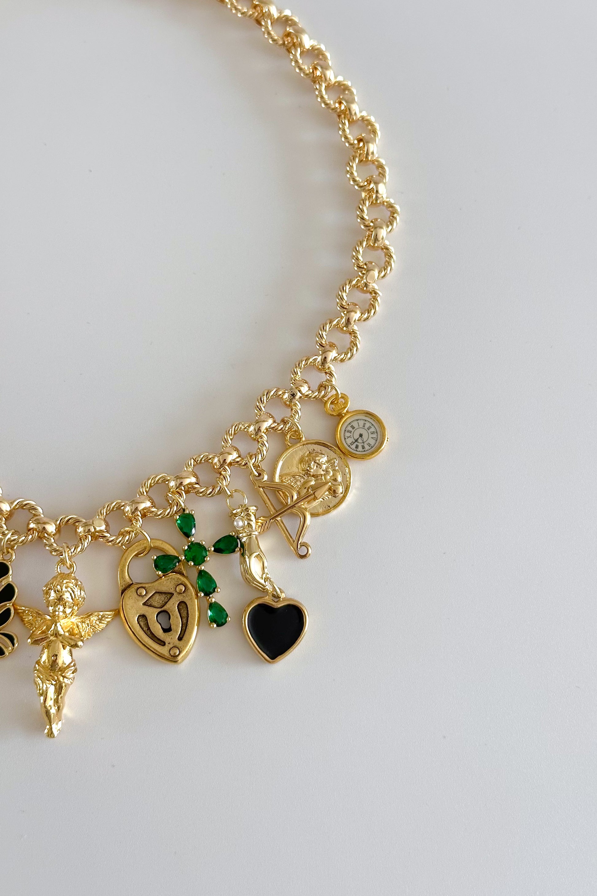 Gold plated charm necklace featuring assorted dead stock charms - variety of vintage, raw brass, resin, acrylic, zinc alloy, glass, crystal, and gold plated charms