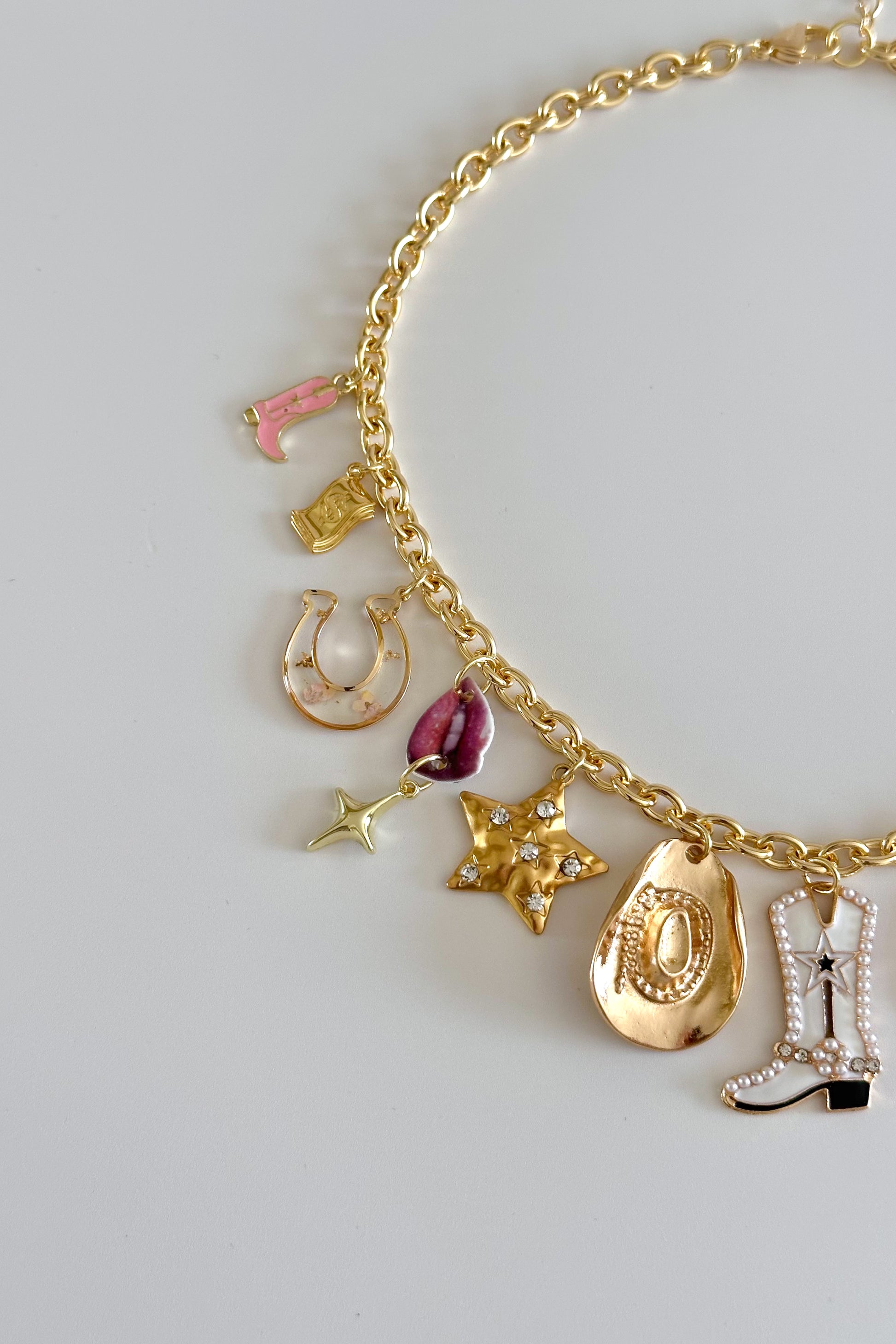 Gold plated charm necklace featuring assorted dead stock charms - variety of vintage, raw brass, resin, acrylic, zinc alloy, glass, crystal, and gold plated charms