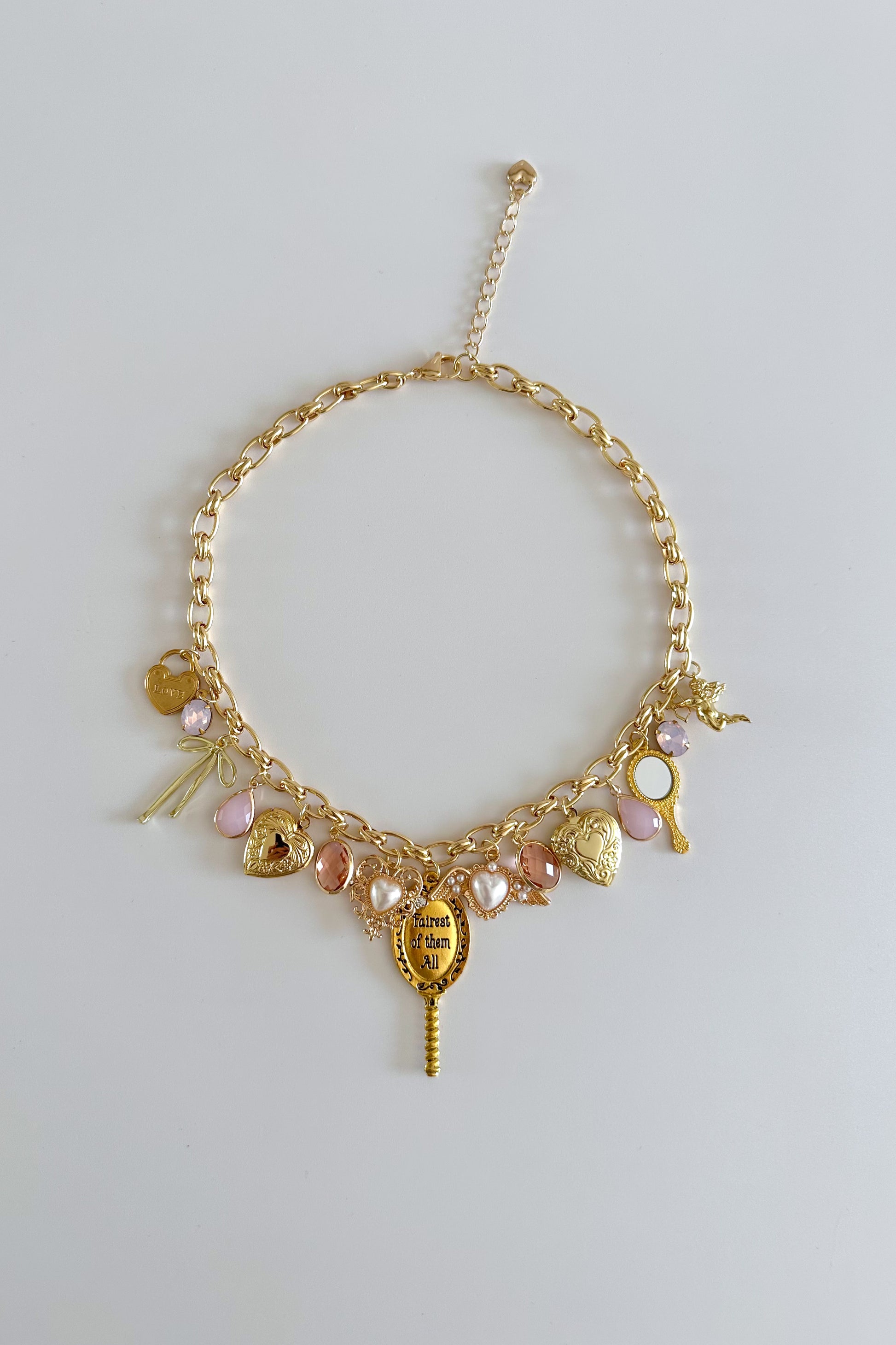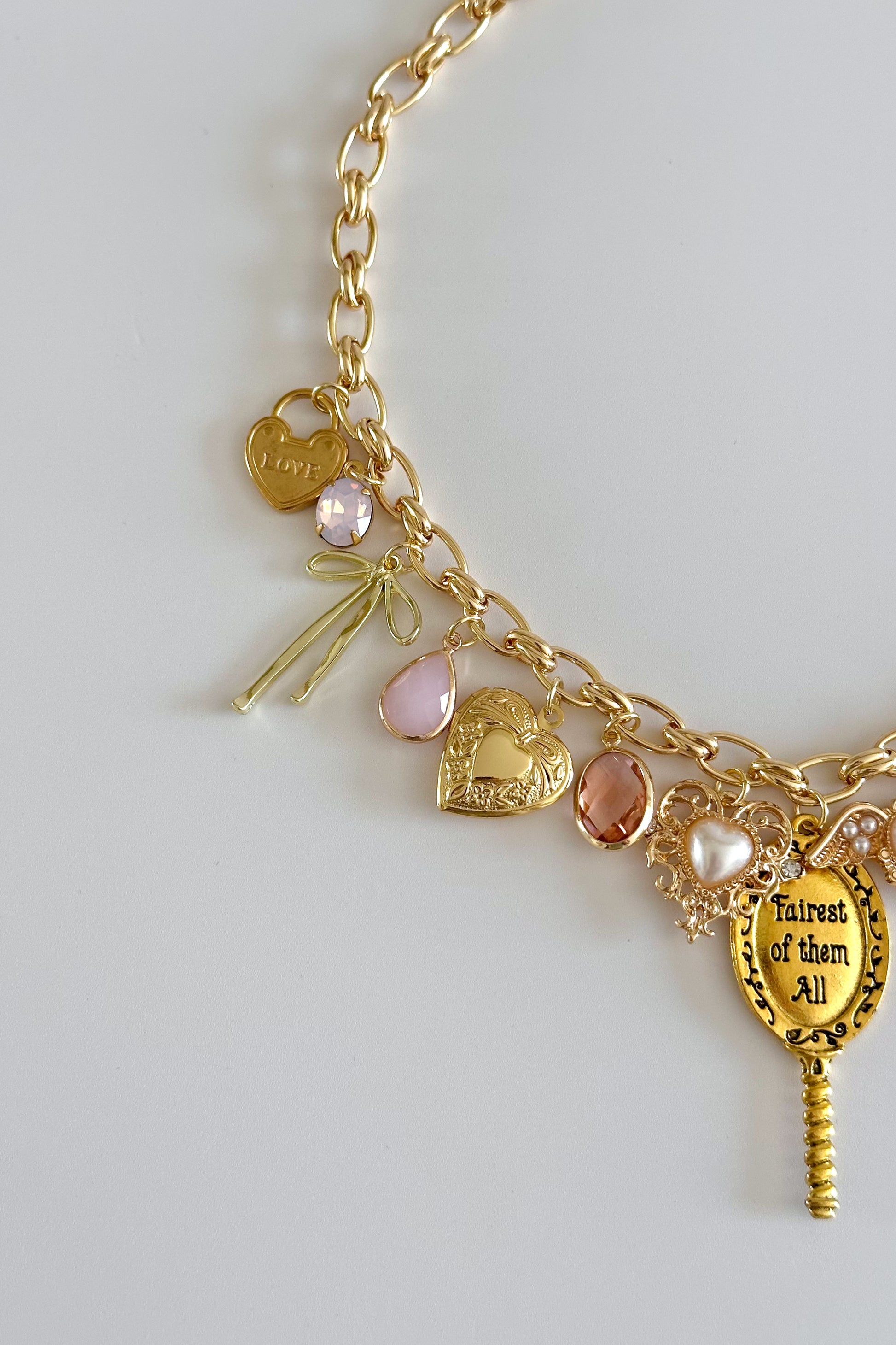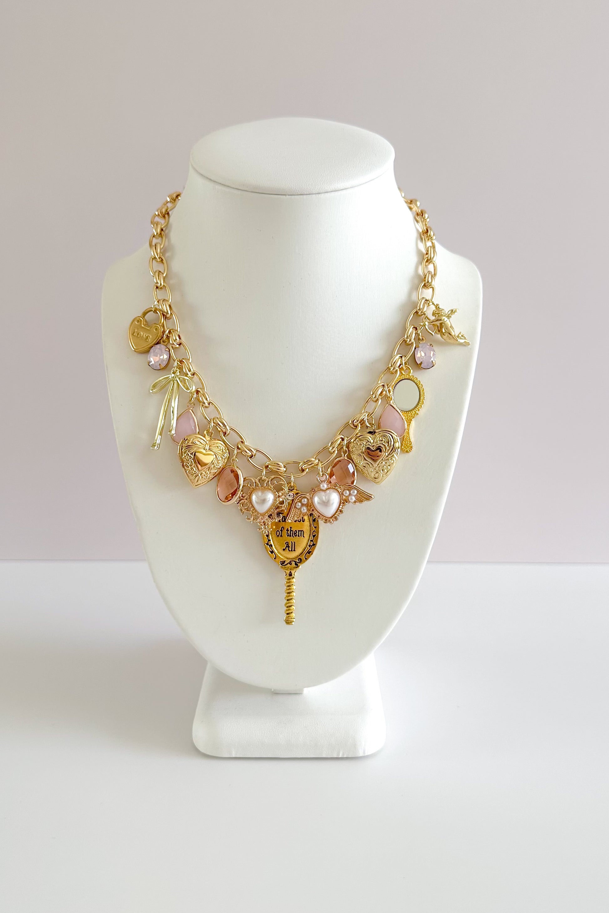 Gold plated charm necklace featuring assorted dead stock charms - variety of vintage, raw brass, resin, acrylic, zinc alloy, glass, crystal, and gold plated charms
